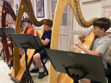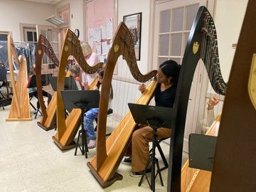 Novice students begin their journey in the Harp I class. A group one hour class is held weekly for ten weeks. Harps are provided for use in class, and a limited number of harps are available for home use for this special introductory class.